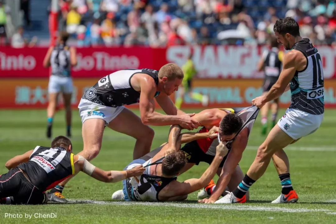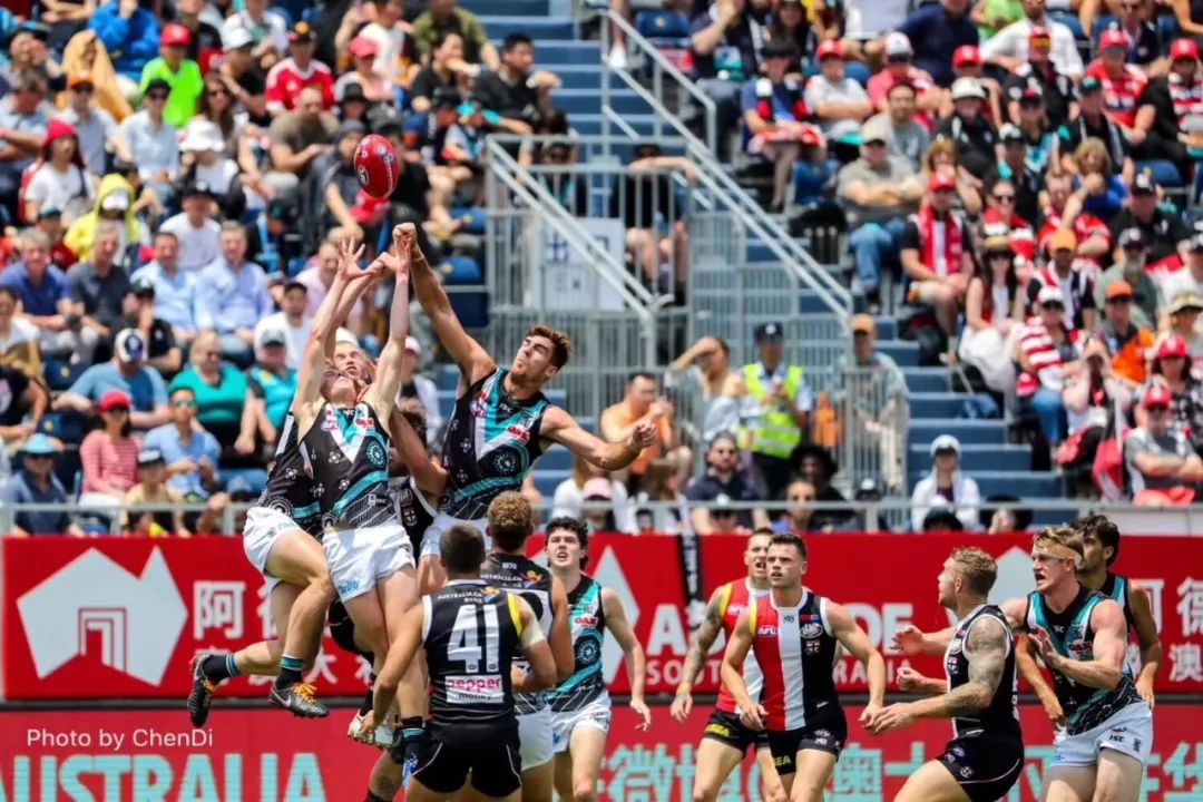 2019澳式橄欖球超級聯(lián)賽(AFL)上海站于6月2日在江灣體育場火熱開賽。比賽當(dāng)天,在澳洲原住民表演的戰(zhàn)舞和中國風(fēng)的舞龍舞獅表演之后,雖然戶外溫度高達(dá)35°C,但絲毫沒有影響澳洲老牌勁旅37次冠軍獎得主阿德萊德港力量隊(duì)與同樣實(shí)力超群的墨爾本圣基爾達(dá)圣徒隊(duì)展開激烈的對決。連續(xù)三年來到上海的阿德萊德港力量隊(duì)坐鎮(zhèn)“主場”,最終以139比69大勝墨爾本圣基爾達(dá)圣徒隊(duì),并在積分榜上躋身前八。