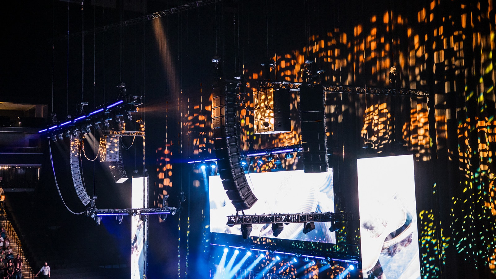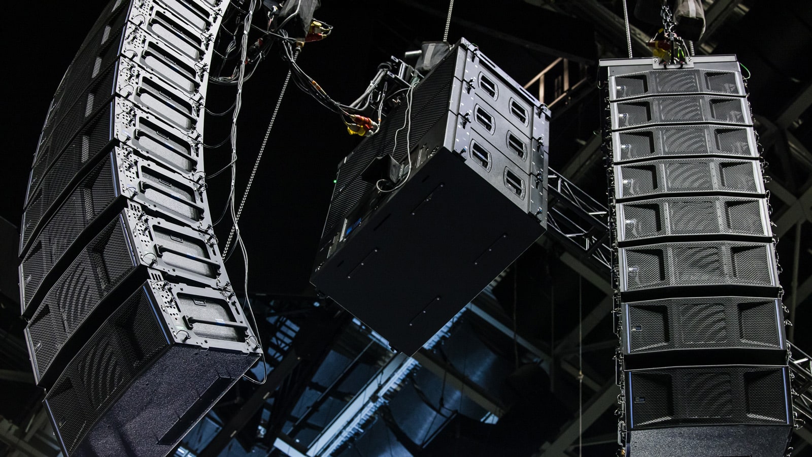 巡演采用了典型的體育場擴(kuò)聲系統(tǒng)配置,主擴(kuò)左右兩組陣列每組各由 12 只 PANTHER 線陣列音箱組成,搭配 12 只 1100-LFC 低頻控制單元增強(qiáng)低音。此外,側(cè)補(bǔ)聲陣列也采用了 PANTHER 音箱。