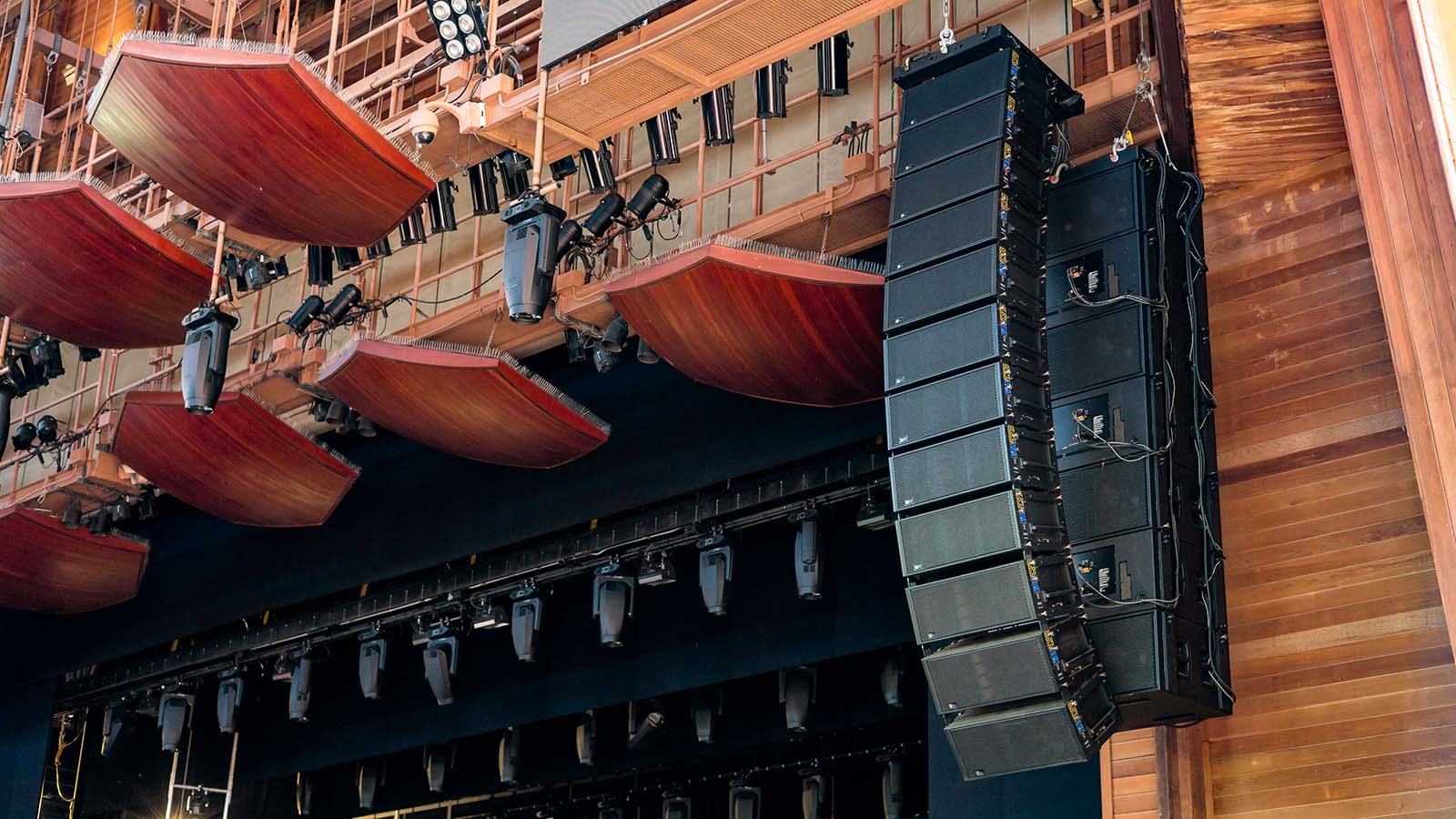 安裝完畢后,新的主擴(kuò)系統(tǒng)由左右各 12 只 LYON 線性線陣列音箱,及中置陣列 12 只 LEOPARD 緊湊型線性線陣列音箱組成。每組 7 只 1100-LFC 低頻音箱組成雙梯度陣列提供強(qiáng)勁的低音,另搭配兩組音箱(每組各 1 只 UPQ-D2 全尺寸音箱和 1 只 ULTRA-X40 緊湊型音箱)分別用作前區(qū)補聲,7 只 ULTRA-X20 緊湊型寬覆蓋音箱提供臺唇補聲,另有 6 只 ULTRA-X20 安裝在樓座下方用于樓座補聲。系統(tǒng)驅(qū)動和優(yōu)化則由 4 臺 GALAXY 816 網(wǎng)絡(luò)平臺處理器負(fù)責(zé)處理。