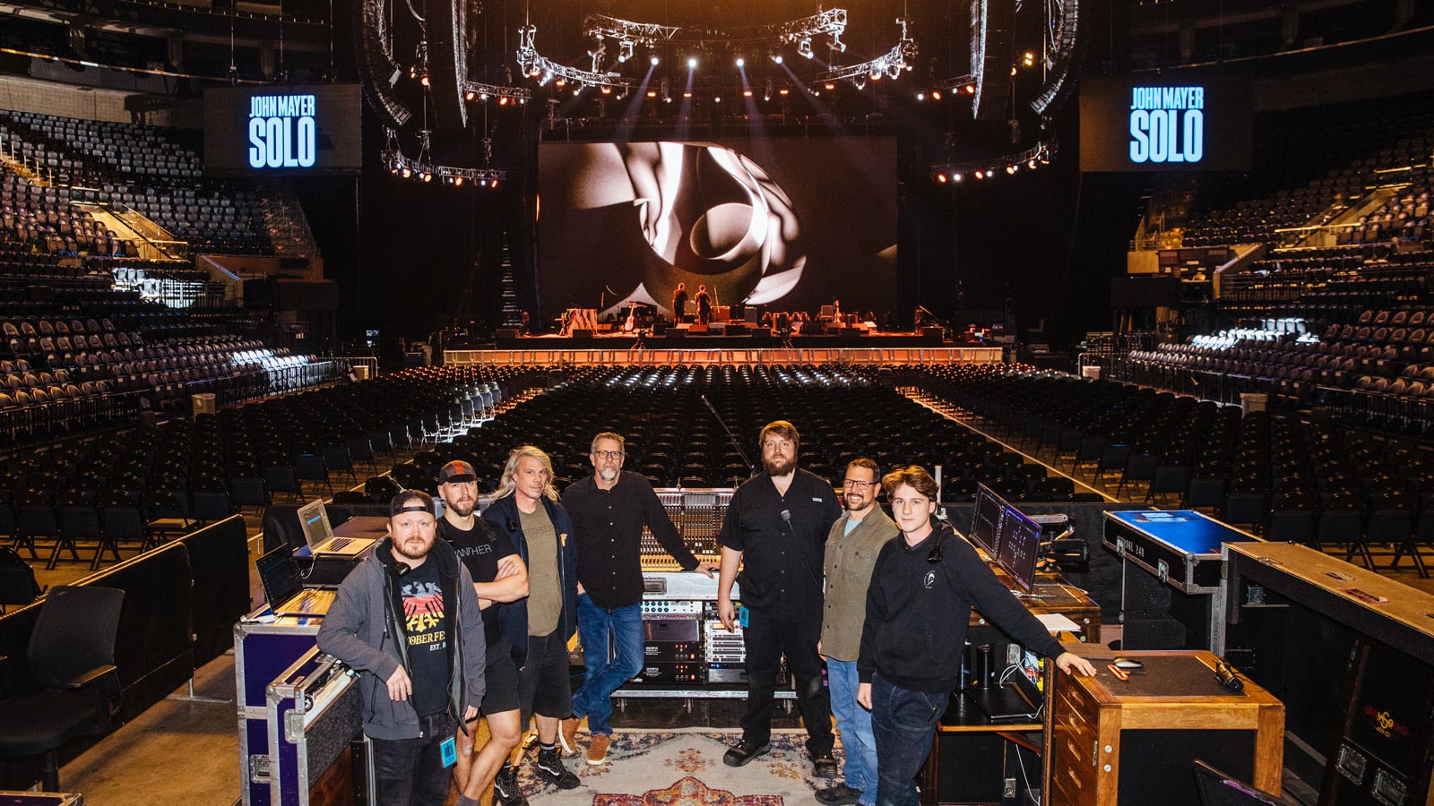 從左到右:擴(kuò)聲技術(shù)支持 Erik Swanson; 系統(tǒng)設(shè)計(jì)師 Michal Kacunel; 擴(kuò)聲技術(shù)支持 Sean McAdam; FOH 調(diào)音師兼 UltraSound 首席執(zhí)行官 Derek Featherstone; 監(jiān)聽技術(shù)支持 Alex Prichard; 監(jiān)聽工程師 Ian Dubois; 擴(kuò)聲技術(shù)支持 Riley Gajewski