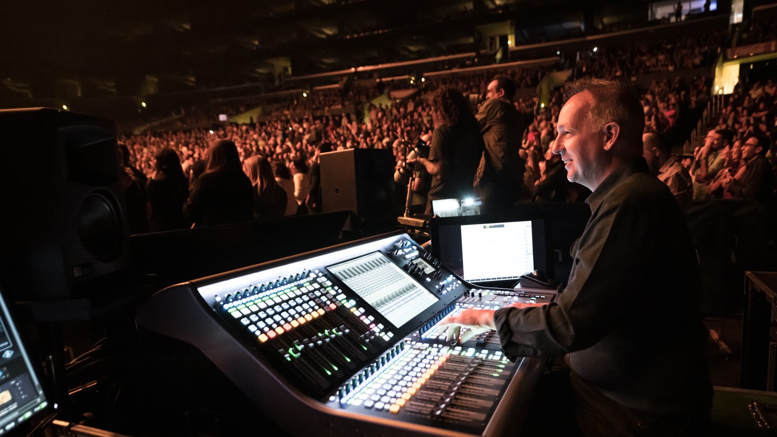 正如之前的“An Evening with Michael Bublé”巡演一樣,Bublé 一邊唱一邊悠然地漫步到 B 舞臺,借助 Meyer Sound Spacemap Go 空間聲音設計和混音工具,可以在現(xiàn)場空間對其聲音實時追蹤。Doubet 說:“這次主舞臺和 B 舞臺都配備了同樣的 PANTHER 系統(tǒng),保證了 Michael Bublé 在兩個舞臺間緩慢移動時聲音音調(diào)的一致性。同時,也使系統(tǒng)調(diào)試時匹配陣列更容易?!北敬窝惭莸囊纛l團隊主要包括系統(tǒng)工程師 Fred Cantin及監(jiān)聽工程師 Martin Paré 和 Renato Petruzziello 等。