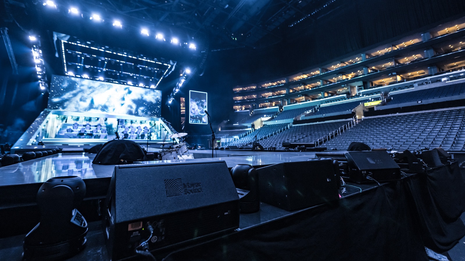 主舞臺系統(tǒng)由兩組前置主擴陣列組成,每組下部分為 4 只 LEOPARD,上部分為 14 只 PANTHER。左右兩組側(cè)補聲陣列每組各 14 只 LYON 音箱,前置補聲則為 8 只 ULTRA-X40 音箱。另配置兩組吊掛的陣列用來增強低音,每組各 6 只 1100-LFC 低頻控制單元,外加置于地面上的 4 只 900-LFC 用于補充低音效果。