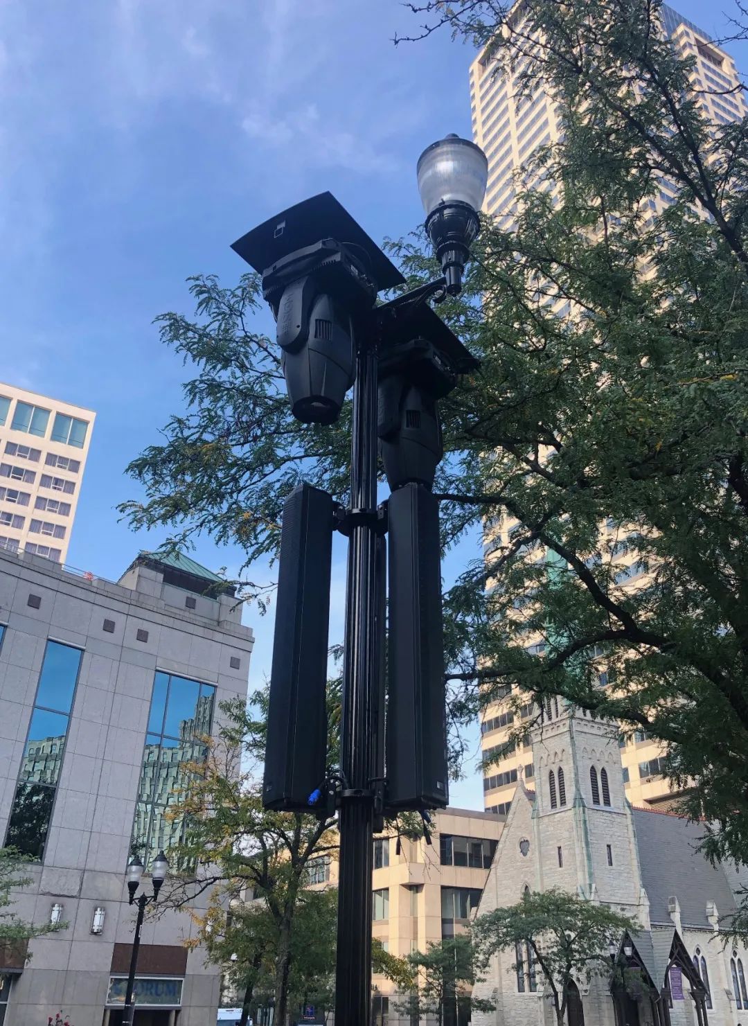 Cassler說(shuō):“我們考慮了幾種選擇,包括小型分布式揚(yáng)聲器,大型揚(yáng)聲器塔,甚至是相鄰建筑物上的陣列。但是這些解決方案都不夠,要么缺乏音頻功能或保真度,要么提出了美學(xué)上的異議。Meyer Sound CAL解決方案使每個(gè)人都感到高興。揚(yáng)聲器在設(shè)計(jì)中融入了燈桿,基本上就是以前的燈桿的復(fù)制品。CAL的精確射束轉(zhuǎn)向能力使我們能夠調(diào)整精確的覆蓋范圍,以保持較高聲壓級(jí),并減少圓圈外的聲壓級(jí)。最后,由于CAL直接連接到AVB網(wǎng)絡(luò),因此我們可以使到揚(yáng)聲器位置的新管道的尺寸最小化。”