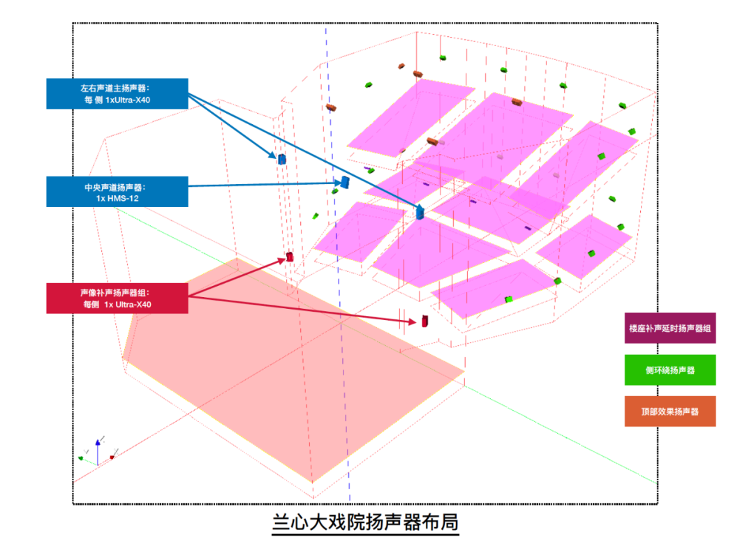 中央聲道采用1只Meyer sound HMS-12獨立覆蓋池座及樓座全場觀眾區(qū)域,從而實現(xiàn)為全場提供清晰的語音擴聲。左右聲道各采用1只Meyer Sound Ultra-X40緊湊型寬覆蓋揚聲器,完整覆蓋池座及樓座全場觀眾區(qū)域。
