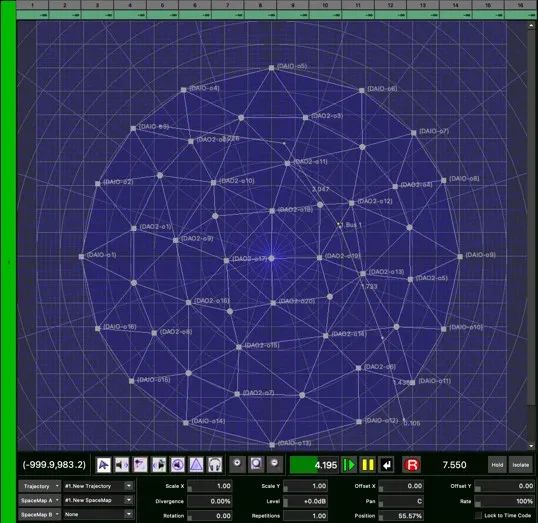 不同于傳統(tǒng)的基于聲道的多聲道影院方案(如5.1,7.1聲道)。Spacemap是先進的基于對象的音頻控制技術(shù),使用恒定功率分配的聲像定位方式。Spacemap通過在多只揚聲器之間制造幅度差來對聲源進行定位,對于給定的聽音范圍,這種定位方式能夠提供最為聚焦的聲像。通過空間中三點構(gòu)成平面的想法,將三維的的空間通過若干個三角形展開成一個平面的模式,Spacemap通過三種節(jié)點:揚聲器節(jié)點、虛擬節(jié)點和靜音節(jié)點根據(jù)不同的需求來構(gòu)筑“聲學三角形”,從而提供一個直觀的控制界面,音效設(shè)計師和錄音工程師可以很清楚地看到聲音移動的情況,同時,也可以很方便去地調(diào)整移動軌跡,以達到令人滿意的音效。